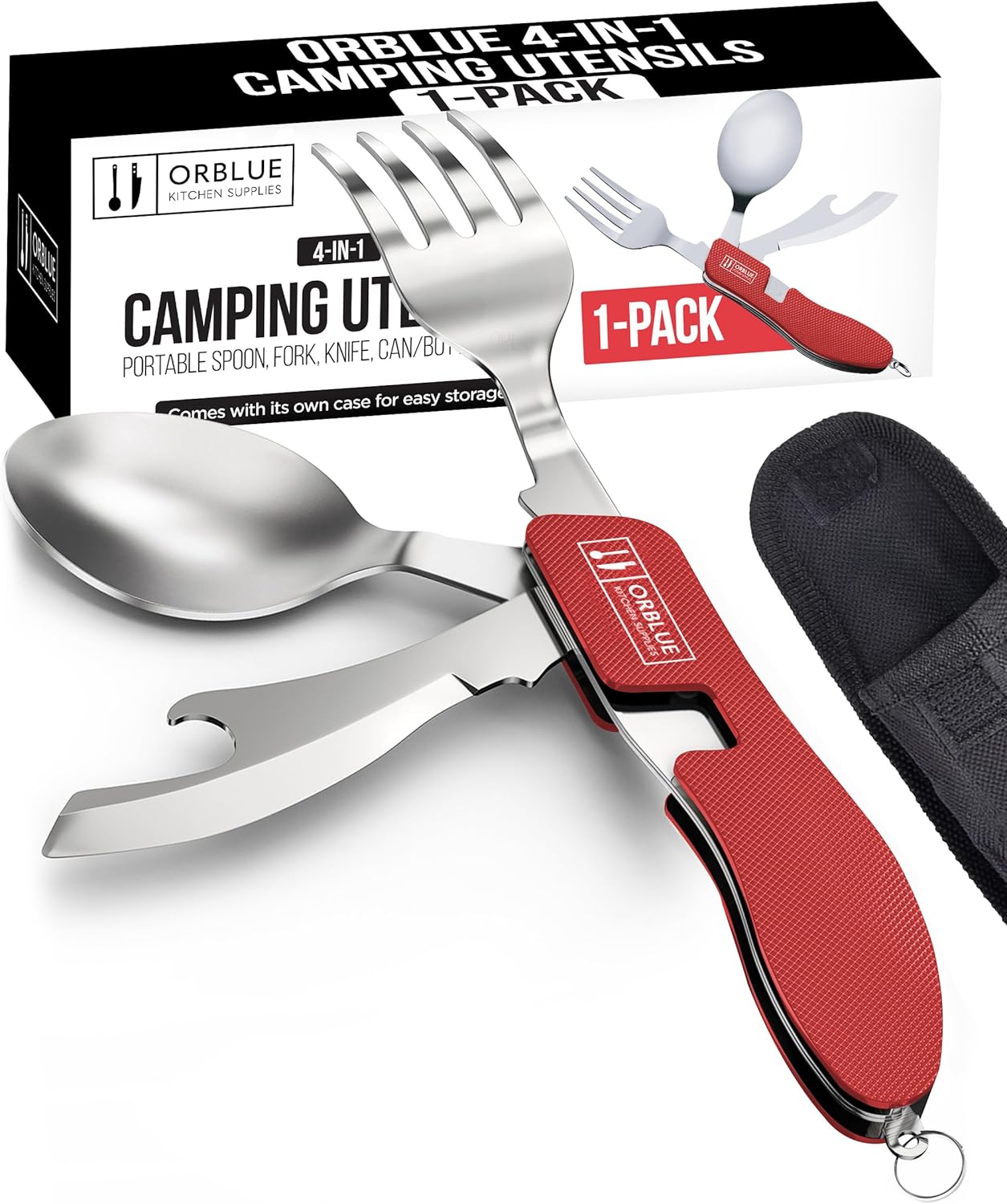Orblue 4-in-1 Camping Utensils, Portable Stainless Steel Spoon, Fork, Knife & Bottle Opener Combo Set - Travel, Backpacking Cutlery Multitool