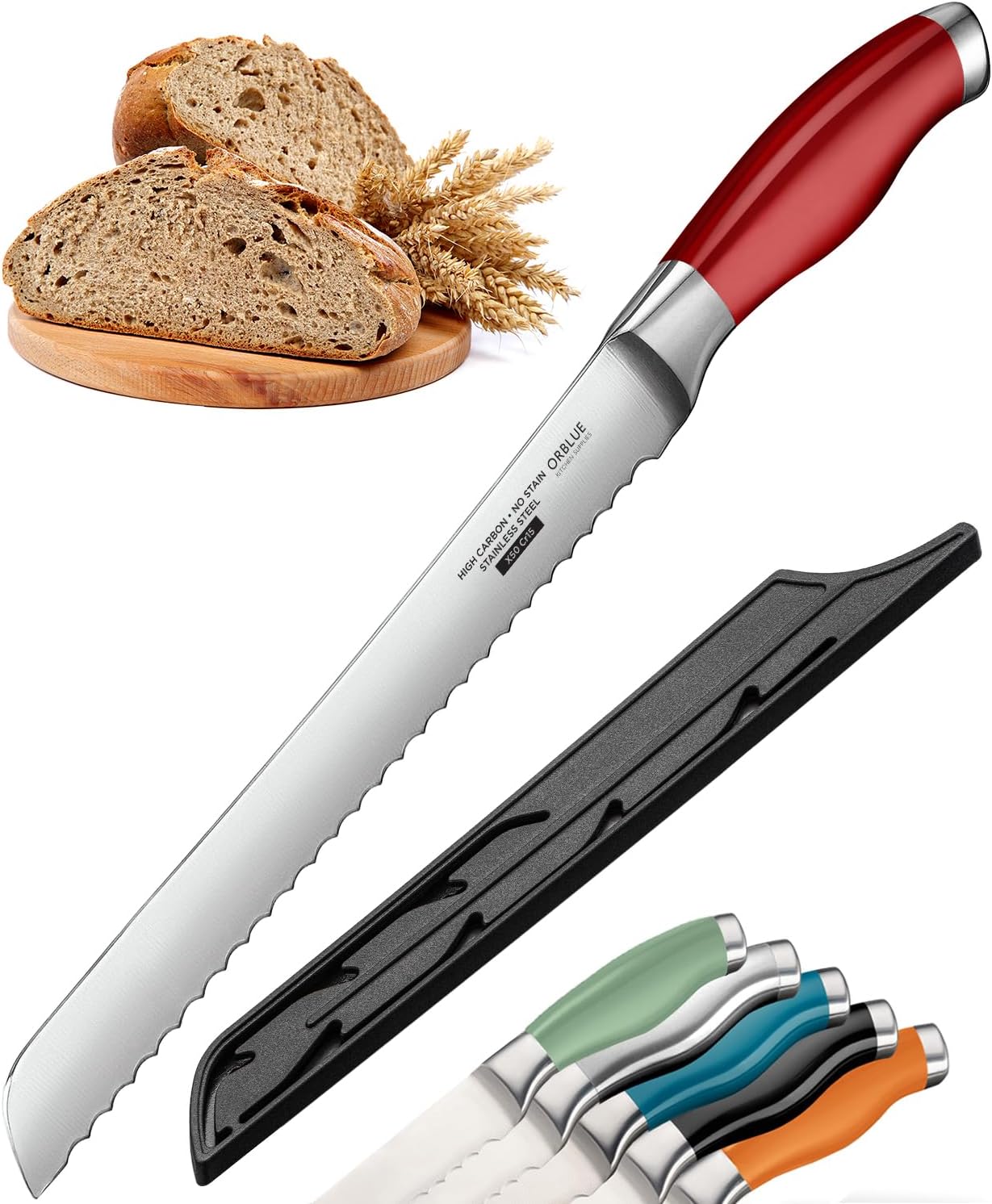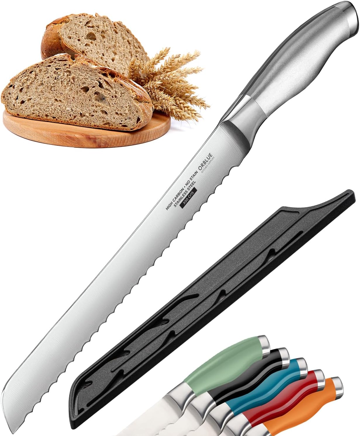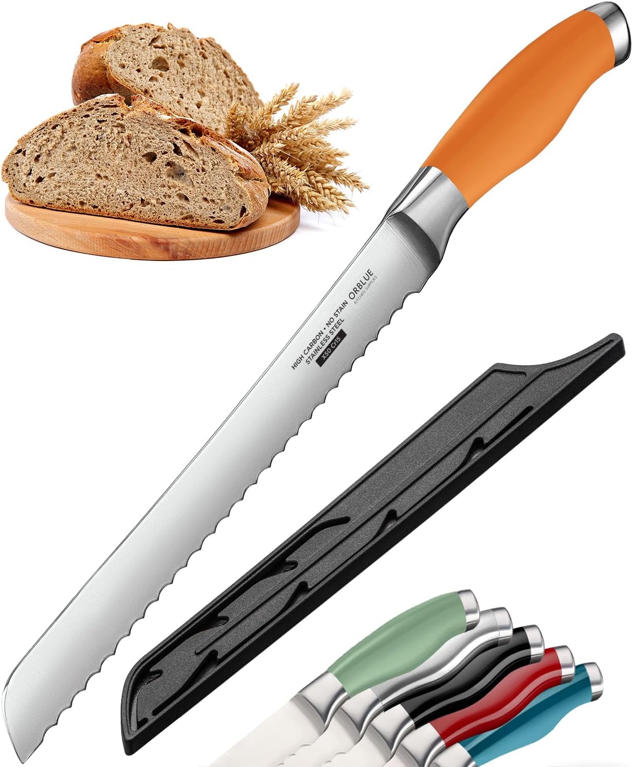 - ULTRA-SHARP, CUTS EFFORTLESSLY: The Orblue Serrated Bread Knife blade has an ultra-sharp serrated edge that grips and effortlessly slices the toughest loaves of bread, to provide a smooth, clean cut. The blade runs 10 inches long with a 5-inch handle. Included as an added safety measure on the knife’s sharp tip is a rubber safety guard.