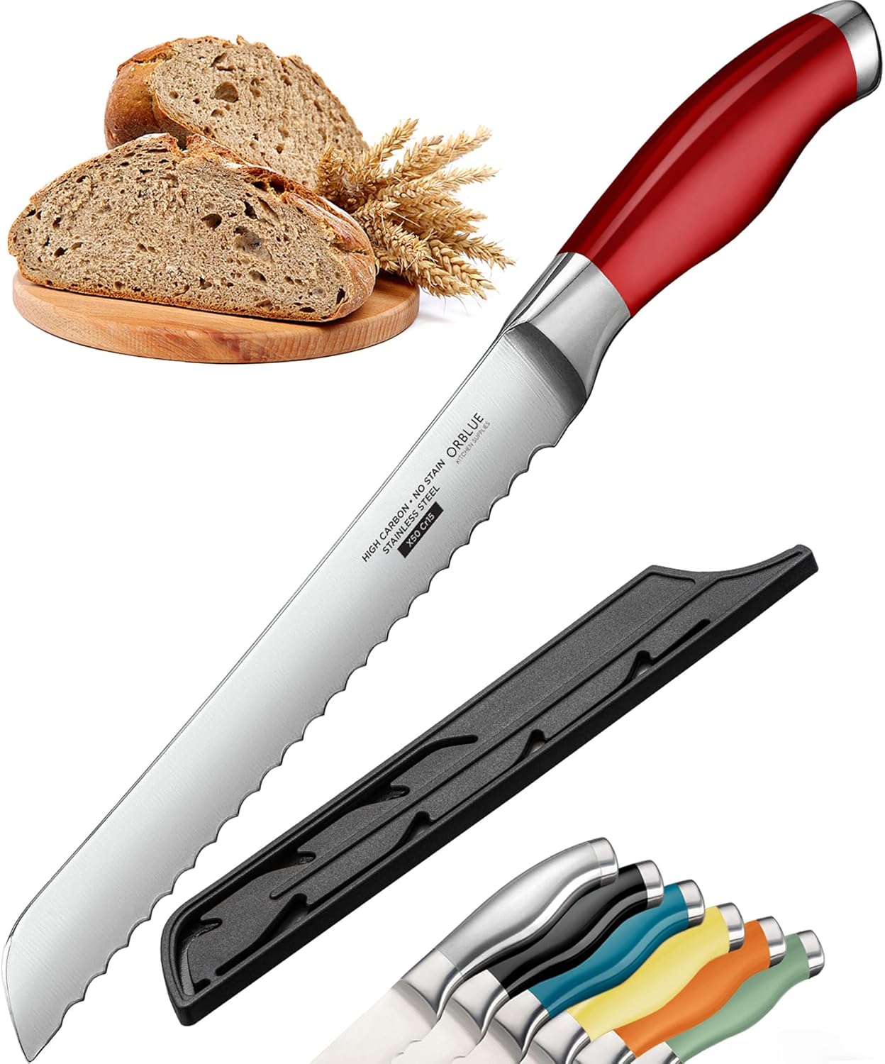 - ULTRA-SHARP, CUTS EFFORTLESSLY: The Orblue Serrated Bread Knife blade has an ultra-sharp serrated edge that grips and effortlessly slices the toughest loaves of bread, to provide a smooth, clean cut. The blade runs 8 inches long with a 5-inch handle. Included as an added safety measure on the knife’s sharp tip is a rubber safety guard.